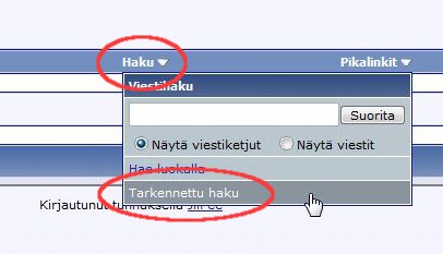 Alla on pari kuvaa, jossa on merkitty hakutoiminnon olennaiset kohdat, kun etsitään omia ilmoituksia. Tämän voi tehdä eri tavoilla, mutta noin äkkiseltään tämä tuntuu menevän yksinkertaisimmin, kun on tarkoitus löytää omat myyntipalstan ilmoitukset, eikä kaikkia aloittamiaan viestiketjuja: 1. Kuvasta 1: klikkaa yläreunan linkkiä Haku ja kun siitä aukeaa laajempi valinta, klikkaa siitä likkkiä Tarkennettu haku. Sen klikkaaminen avaa kuvan 2 mukaisen näkymän. 2. Tästä eteenpäin kuvasta 2: laita hakuvalinnat kuvan mukaisesti, eli: - jätä hakusanakenttä tyhjäksi, ellet etsi jotakin tiettyä sanaa - kirjoita Käyttäjätunnus-kenttään oma tunnus ja valitse sen alta vaihtoehto "Etsi käyttäjän aloittamat aiheet" - etuliitteen perusteella: mikä vaan etuliite, jotta tulee kaikentyyppiset ilmoitukset (aina ei muista miten etuliite oli) - Etsi foorumeita: Osto- ja Myynti (niin ei tule muut juttelut hakuun) 3. Paina Etsi. Sitten editoimaan tai nostamaan säännöt huomioiden vanhaa ilmoitusta. Otan kohta ne vanhat pois ja tämä jää. Etsi tätä ilmoitusta jatkossa. Kuva1: http://forums.offipalsta.com/picture...ctureid=124377 Kuva2: http://forums.offipalsta.com/picture...ctureid=124376 |