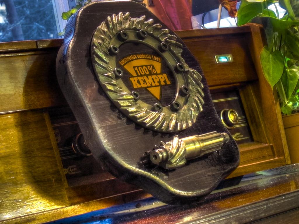 ulkona ovipielessä roikkuu letukan nokka-akseli ja 500m ajettu 12 bolt lautaspyörä mistä puuttuu 1 hammas, ja sen keskelle on joku joskus kantanut kynttilälle telineen, ollu jo monta vuotta eikä pilkkuakaan ruostetta...
