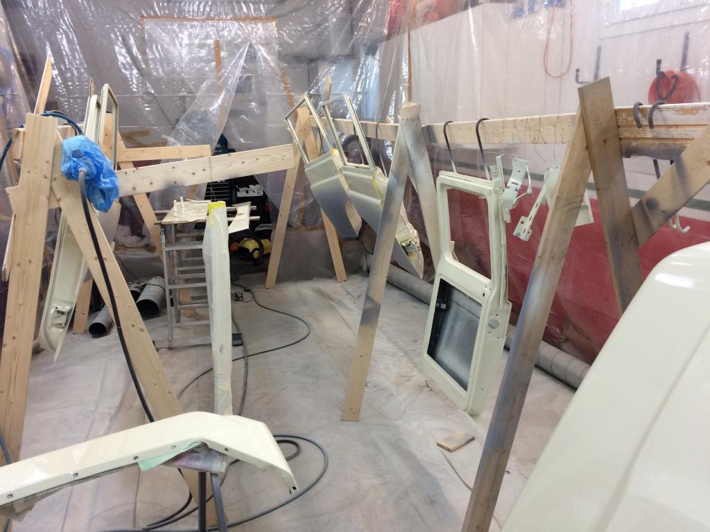Ja homma hieman etenee. Ikkunat otin irti ja karmit paikkasin. Lokareita ja ovia hieman hiekkapuhallellut. Nyt jo uutta primeria pinnassakin ja alkaa näyttää paljon motivoivammalle.