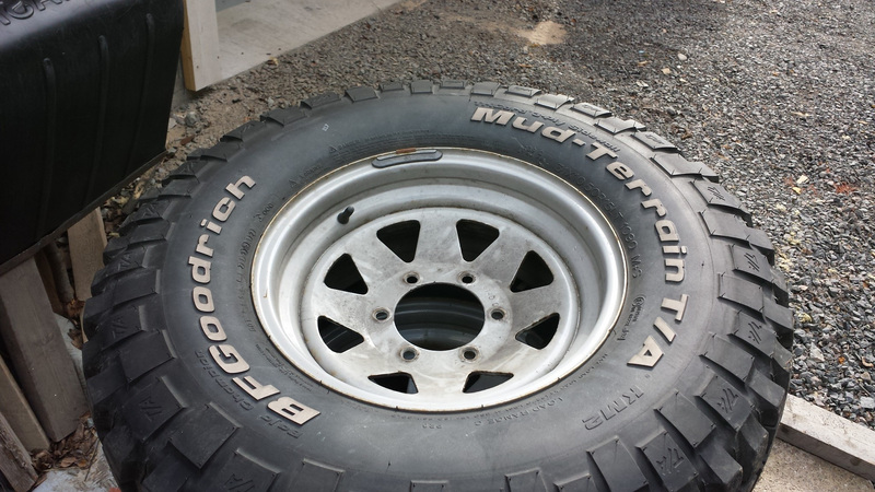 Kyseiset renkaat jäi pajeron alta ylimääräiseksi. Ostin kumet uutena ja ovat olleet reilun vuoden nyt alla. Pintaa keskeltä mitattuna väh. 13mm joka renkaassa, eli käytännössä uutta vastaavat. Ei ajettu metsässä, eli ei viiltoja/halkeamia. Vanteet suorat ja siistit, pulverimaalattu samalla kun hankin renkaat.