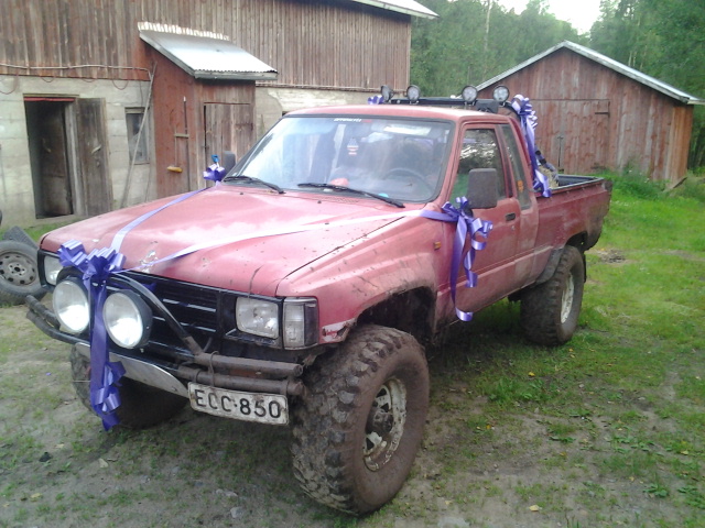 Meillä oli museokuntoinen valkoinen HJ60 hääautona. Ois mulle kelvannut joku vanha muskelikin, mutta en viittinyt maksaa viittäsataa vartin huvista.