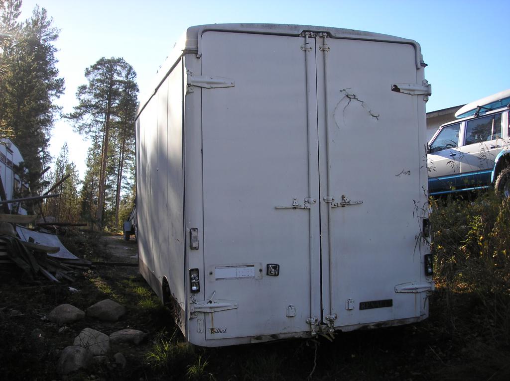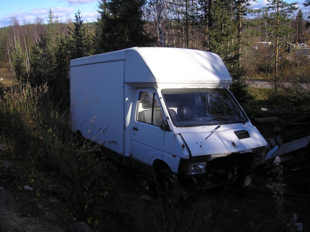 vanha Renault trafic. tekniikka puuttuu. hyvä koppi romun säilytykseen. sisällä jonkun näköisiä hyllyjä. vaihdossa käy 12v vinssi.