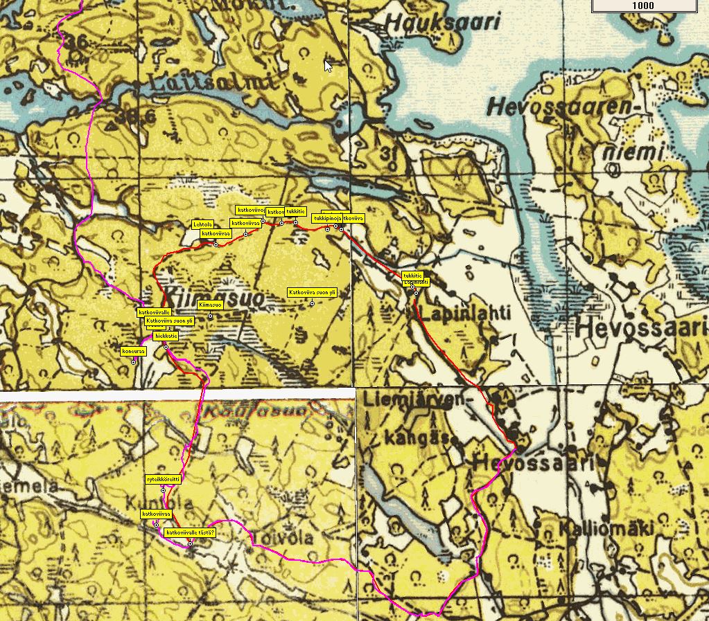 Jos perjantaina töiden jälkeen lähtijöitä on, voisi ajaa johonkin Noskualle leiriin ja lauantai aamuna voisi yrittää "kiimasuon kiertoa" Lapinlahdella Hevossaaressa. Tämä on joku Ilkan ja Roopen / Inteamin talvella ajama reitti jota etsittiin Helatorstaina 2016. Pinkki viiva on silloin ajettu eikä ilmeisesti ollut kuitenkaan se mitä haettiin?