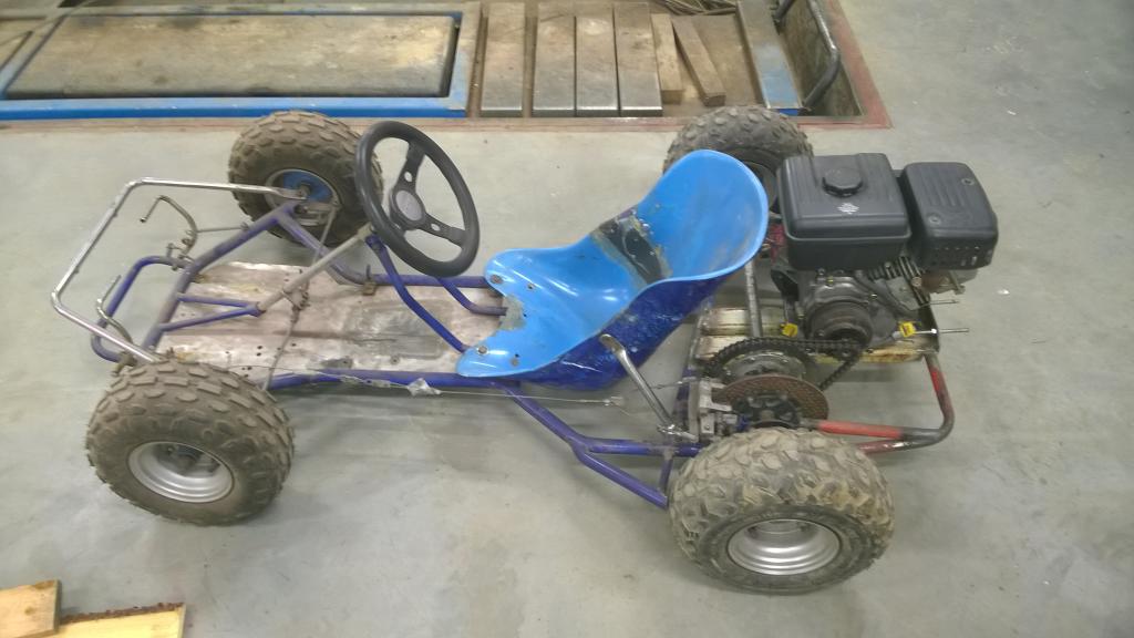 Myydään karting autosta tehty maasto mikroauto. Alkuperäiset vanteet ja renkaat käy paikoilleen jos asfaltille haluaa. Nyt alla 8" mönkijän vanteet ja renkaat. Koneena 4t Briks&Stratton ja vapaa kytkin. Vaatisi kaasarin putsauksen/säädön tai ehkä toisen kaasarin ja kaasuvaijerin. Kone käy hetken jonka jälkeen sammuu. täys kaasulla käy. Tästähän saa virittamällä kivasti lisää tehoa. Myyn koska muksulla on jo ihan tarpeeksi leluja ja kaikkeen ei vain aika riitä.