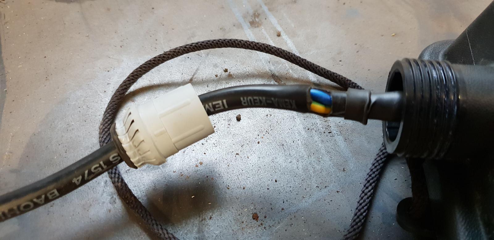 Kyllähän se laatikko aukesi kun väänsi vain kovempaa. En löytänyt nurkista 90 asteisella pistotulpalla olevaa 1,5 mm kumikaapelia joten korjaukseksi tuli kuitenkin vaan kutistesukkaa nirhauman päälle. Tämä tuskin kestää montaa vuotta, eli täytyy vaihtaa parempi johto tillalle jossain vaiheessa.