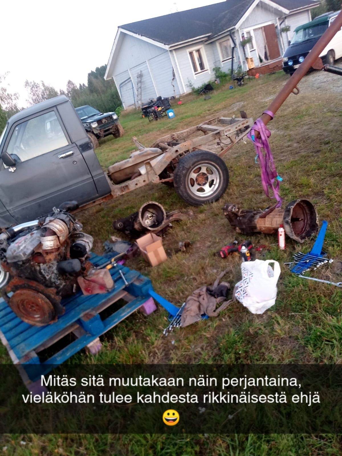 Noniin. Nyt työn alla on sitten ollutkin tämä viimeisin tulokas. Yhteinen elämä alkoi vaihdelaatikon vaihdolla kenttäolosuhteissa, jotta sai auton liikkumaan ominvoimin. :o