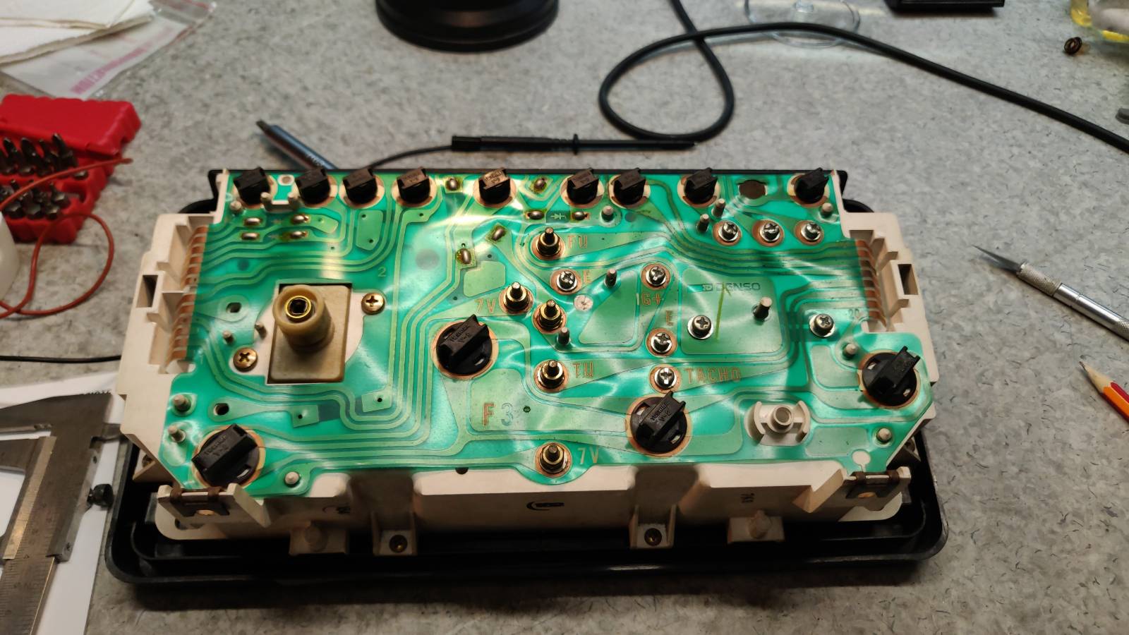 Tässä myös ensin perustutkimusta. Mittareiden toimintaperiaatteesta ja antureiden ominaisuuksista ei ollut tietoa kun ei ole koskaan tarvinnut korjailla näitä. Nopeasti selvisi, että molemmat mittarit ovat lämpösähköisiä. Sähkävirralla lämmitetään bimetalli liuskaa mikä sitten kääntää viisaria. Anturit pelkkiä vastuksia. Bensatankissa reostaatti ja lämpöanturi NTC vastus. Konttorilla kun ei sattunut olemaan bensatankkia ja lämpöanturia niin vastusten suuruudet selvisi myös kokeellisin mittauksin. Osoittautui, että molempien mittareiden alue alatapista ylätappiin vastaa 10 ... 60 ohmin anturivastusta. Muita havaintoja oli, että mittareille syötettävä jännite on reguloitu jotta akkujännite ei vaikuttaisi mittauksiin. Regulointi on vaan toteutettu menneen maailman menetelmin. Mittaristossa on erillinen bimetallirele mikä värähtelee harvakseltaan (muutama jakso sekunnissa). Tällaisella systeemillä on-off aikaa säätämällä voidaan tuottaa aika lailla vakio keskiarvo jännite mittareille. Tällaiset bimetalli liuska mittarit kun ovat valtavan hitaita niin tämä jännitteen värähtely (pätkiminen) ei näy viisarissa mitenkään.