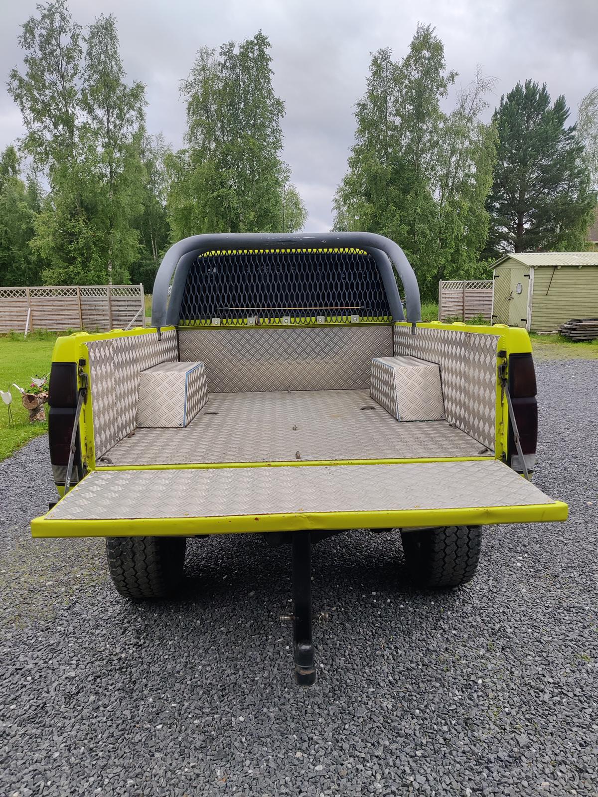 Otsikon mukainen kinkku olisi ylimääräisenä. Reilu 10v sitten ollut hytti ja lava irtaallaan jolloinka ne on puhallettu ja maalattu sekä runko myös korjattu ja maalattu 2x epoksilla. Lavassa ei muuta alkuperäistä kuin kylkipellit ja valot, muuten rakennettu kulma ja lattaraudasta sekä pultattu alumiinit sisälle + kunnolliset sidontakoukut tehty. Hytissä palkkihelmat sekä pohja maalattu epoksilla.