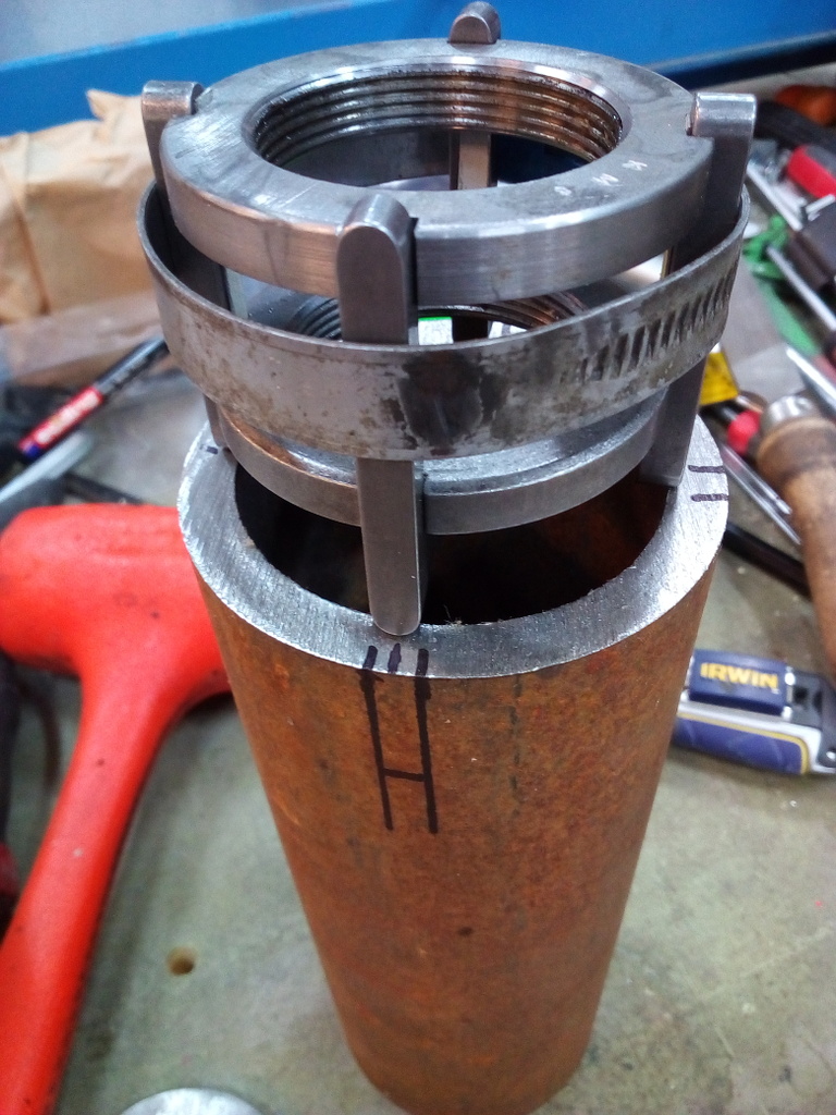 Jotakin on tämänkin parissa tullut vähän turattua. Mutteriin ehkä sopiva KM8-hylsy maksaisi verollisena 150 euron luokkaa ja vaatisi silti sepittämistä. Erikoistyökalu marmoritiskiltä rahteineen on sekin toista sataa. Tein oman avaimen siihen vetoakselin mutteriin. En löytänyt sopivilla D/d mitoilla ohuempiseinäistä putkea kuin pihalla sateessa jaloruostutettua 8mm ainesputkea. Kun ei ole sorvia, niin se sai kelvata sellaisenaan.