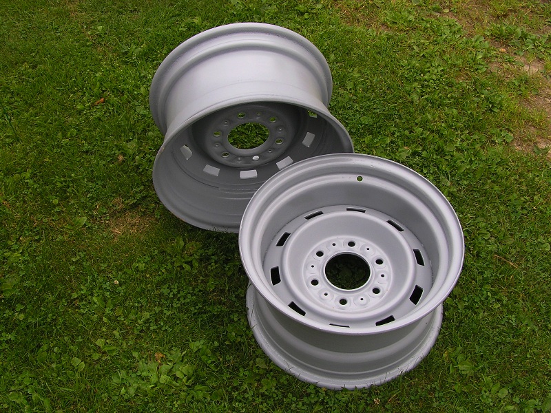 eli 4wd pick-upin orggis 8x15" vanteet, harmaat ja maali on vielä vähä tahmeaa, vanteet on puhallettu ja vedetty harmaa merikelpoinen pohjamaali / päälle ohkonen kerros (hopean)harmaata panssarimaalia samalla kun kaverin traileria maalasin, jokainen värjätköön haluamallaan tavalla jos ei kelpaa.