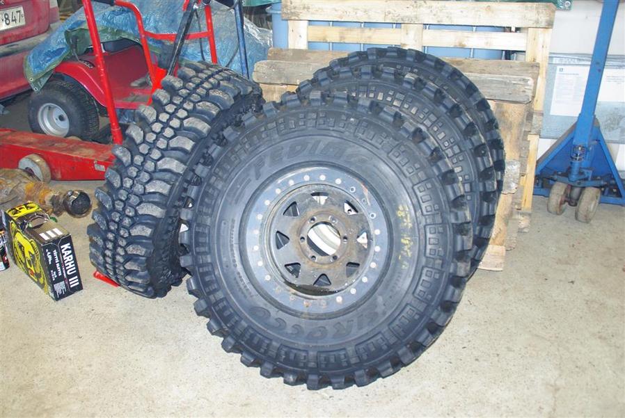 Myydään tai vaihdetaan Fedima Sirocco 35/10.5/16 renkaat 4 kpl. Renkaat on kunnossa ja niissä riittää pintaa hyvin. Kuvassa näkyy tönärillä mitattuna pintaa vähän reilu 14mm. Mittailin muita kohtia niin jossain jopa 17mm. Renkaan todellinen korkeus on noin 36.5". Vanteet ovat beadlockit. Renkaat ovat todella vahvat. Nollapaineella ei muuta vielä muotoa hirveästi ja kestävät renkaat on.