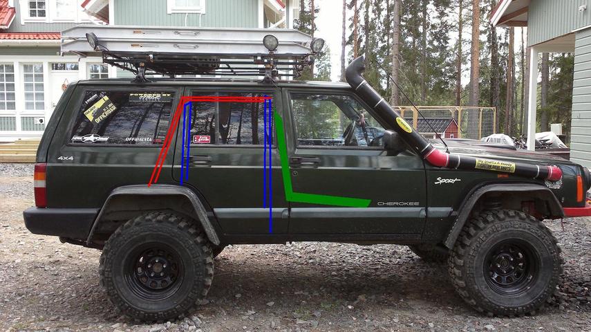Noniin, TML:ssä oli missattiin niin paljon pisteitä kaarien puuttumisen vuoksi, että nyt täytyy ryhdistäytyä tämän kanssa. Eli aiheena kaaret Wrangleriin ja tavoitteena saada järkevät kaaret joilla pääsee suunnistuskisoihin sekä varmistaa mahdollinen laajennettavuus AKK-sääntöjen mukaiseksi (http://www.autourheilu.fi/attachemen...9-32-16218.pdf). Liitteenä on pari kuvaa jotka kertovat millaiset kaaret Wranglerissa on alunperin, ja yksi Paintilla maalattu kuva esittämässä suunnitellun kaaren perusrakennetta.