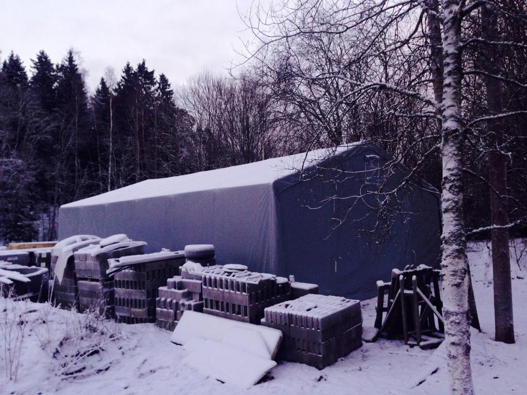 Tuommoisen 8x12m hallin pistin takapihalle pystyyn syksyllä, eikä vielä ole lumitöitä tarvinnut tehdä, kun sai pressun niin kireälle ja siististi että lähtee lumet ihan itsestään.