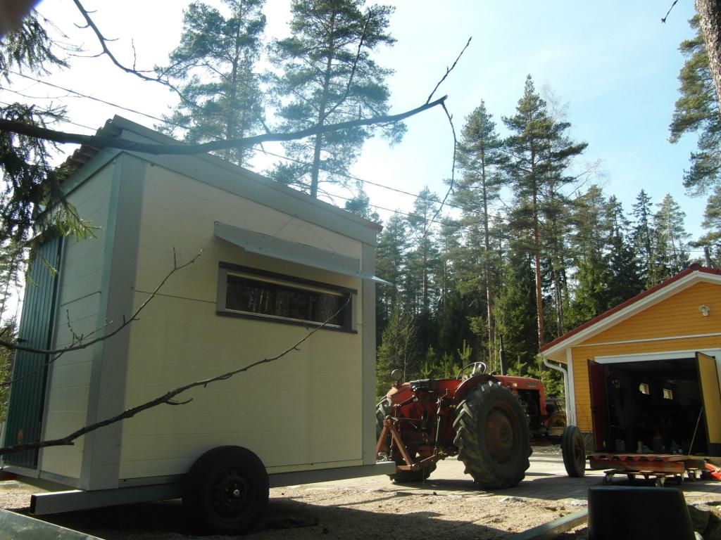 Hiukan parempi koppi, runko 100*100 metallipalkkia, seinät katto ja lattia paroc elmentistä katolla lisäksi pelti.. Tarkkailuikkuna l.126 k.30 joka aukeaa sivulle. Sisämitat pituus 220 lev.175 ja kork.206/193 . 2 tukevaa tasoa kahdessa tasossa jotka liikkuvat erikseen (aseelle hyvä tuki). Oveen kaksi avainta.