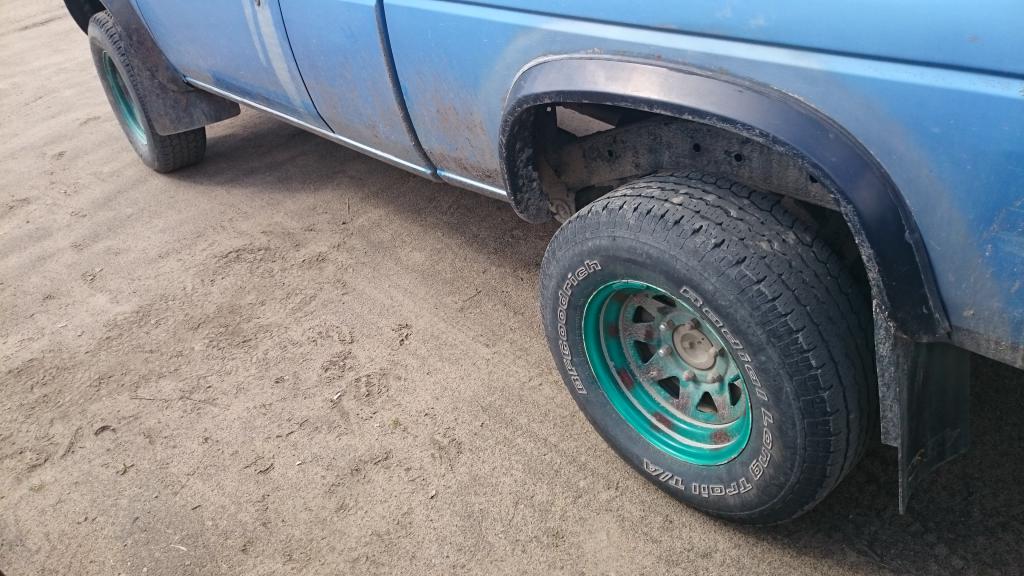 Rekisteriotteessa renkaat 31x10,5 R15 ,tällä hetkellä alla BF Goodrich All Terrain 235/75 R15 Stilauton mod. Off Road Star Alumiinivanteilla. Autoon löytyy 4 Rengas sarjaa , Camo maalatut Mangels vanteet /BF Goodrich Long Trail 235 75 R15 , kumeilla ajaa kesän. Kullan väriset Mangels vanteet/2 kumia Hankook Dynamic MT rt01pintaa on reilusti mudassa rypemiseen ,vanhat. Toiset kaksi kumia Bf Goodrich Trailmaker 235 75 R15 , vanhat ja toisessa ilmeisesti runko vaurioitunut.