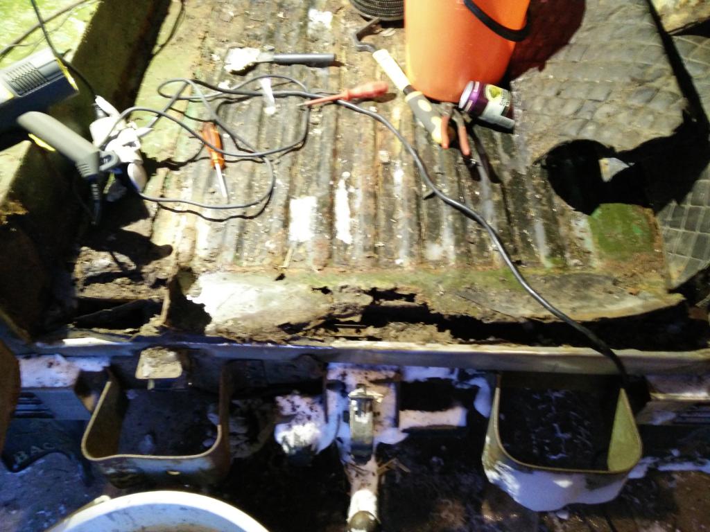 Tallissa sitten pientä bitumimaton poistoa muutama paikkakin siinä tuli esille jotka pitää hitsata ennen konttorille vientiä. Takaovien alapuolen palkin oli rotat syöny kokonaan ja jätöstäneet vain ruskeata kuonaa tilalle. Lokasuojat oli joku jo aiemmin vaihtanut ja näyttivat vielä tuossa vaiheessa ihan käypäsiltä kamppeilta.