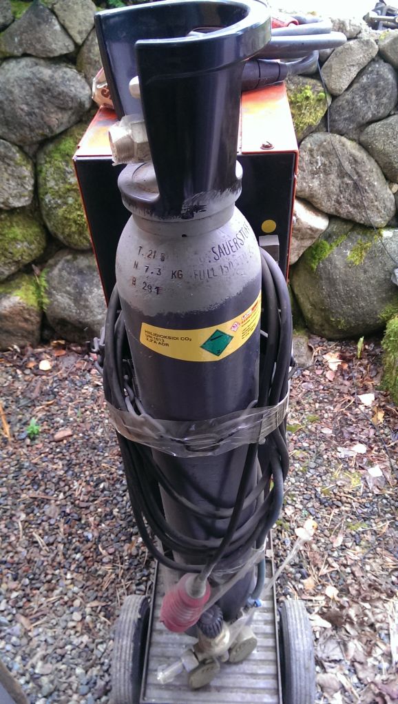 Kuvan mukainen toimivana muutaman vuoden varastoitu Kemppi ja pullo mittareineen. Lankaa ja maskikin saattaa löytyä.