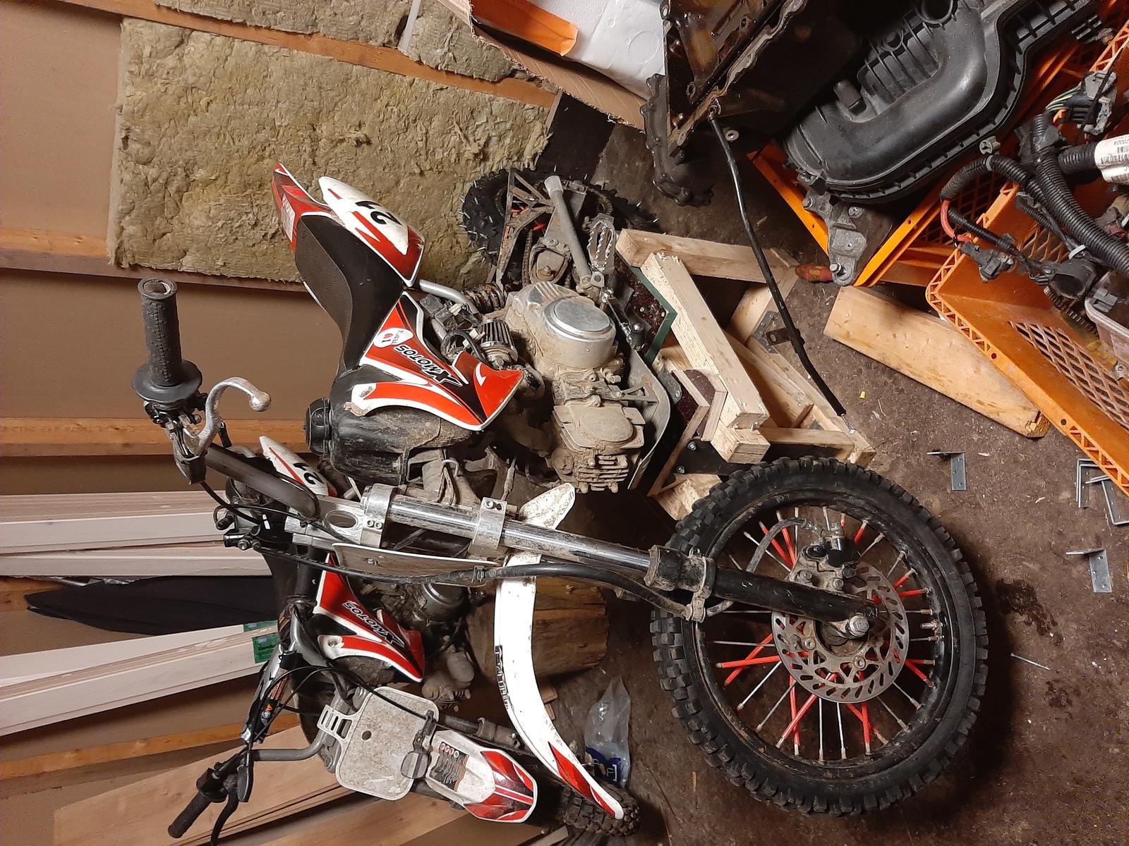 Käy ja kukkuu. Takajarru ei toimi ja renkaat+sisuskumet pitää uusia. Takana pysyy Ilma tehty ruuvi nastarengas,etu rengas revennyt kyljestä.