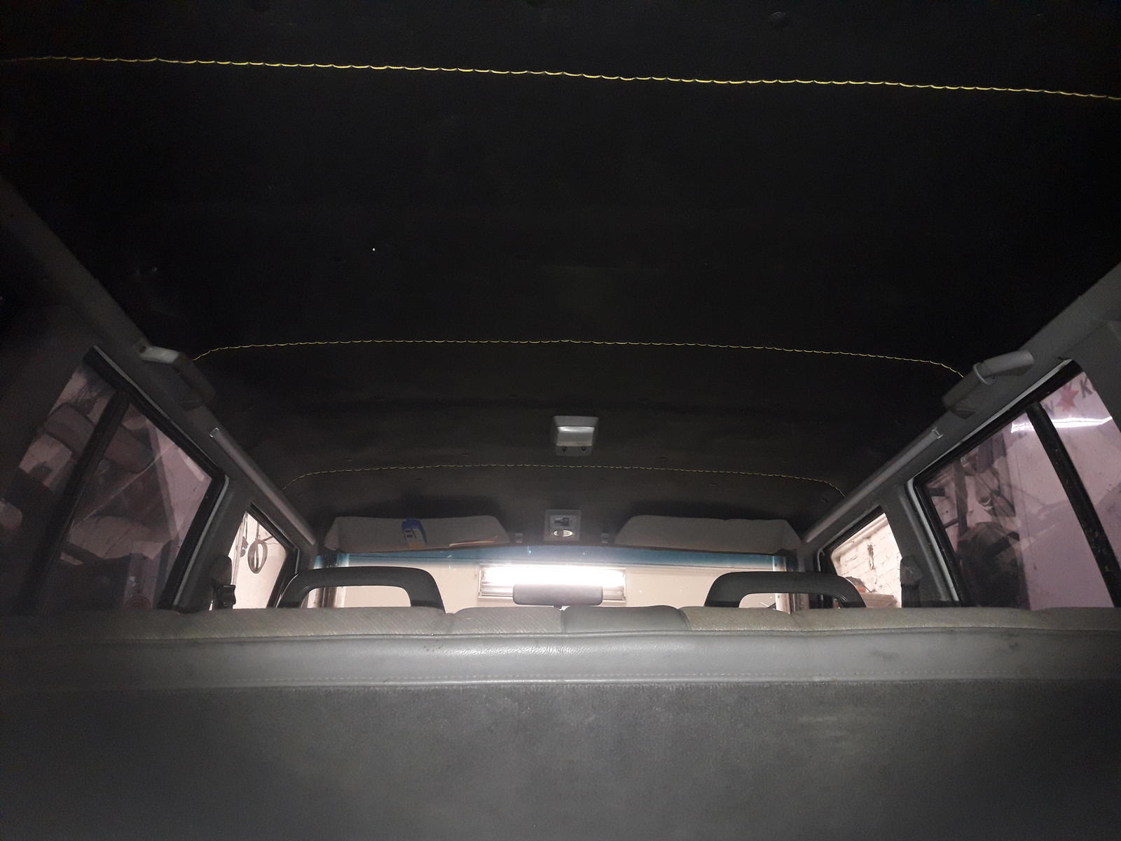 Pari viikkoa sitten tein kattoverhoilun uusiksi. Alkoi menemään hermot kun vanha repaleinen pappakalsari kangas irtosi aina liimauksesta ja roikkuvat repaleet hinkkasi päätä kun ajeli. Liimasin nahan kolmella eri liimalla kattoon. Ajatuksena että joku toimisi. Hyvältä näytti kun sain nahan liimattua. Kävin kahvilla ja tulin takaisin talliin ni nahka oli, kuin perunapelto. Epätoivoisena kokeilin muovisia sisustustulppia, mutta ne ei vakuuttanut. No ei auttanut ku tehdä neula rautanaulasta ja tallista löytyi keltaista linjalankaa.