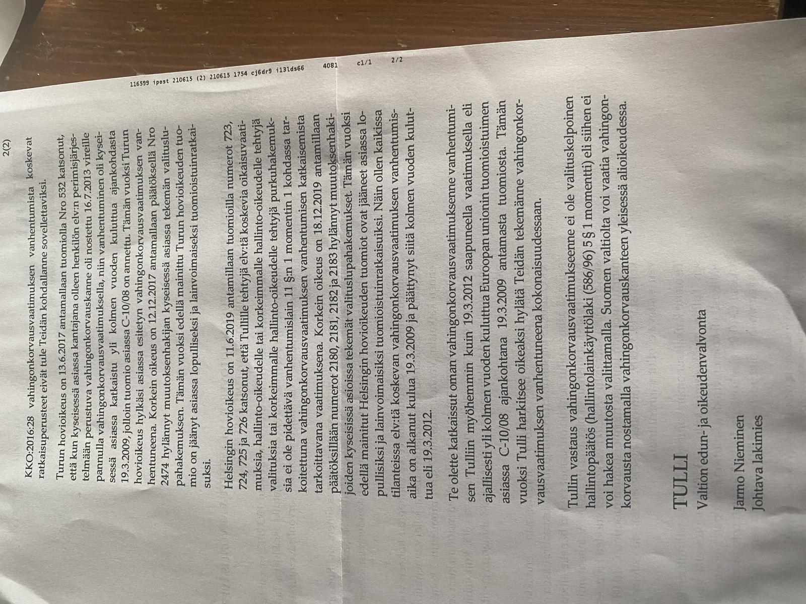Joo, jänniä on sanankäänteet ja lopullinenkin lausuman muoto: ”Tulli harkitsee oikeaksi hylätä Teidän tekemänne vahingonkorvausvaatimuksen vanhentuneena kokonaisuudessaan.”