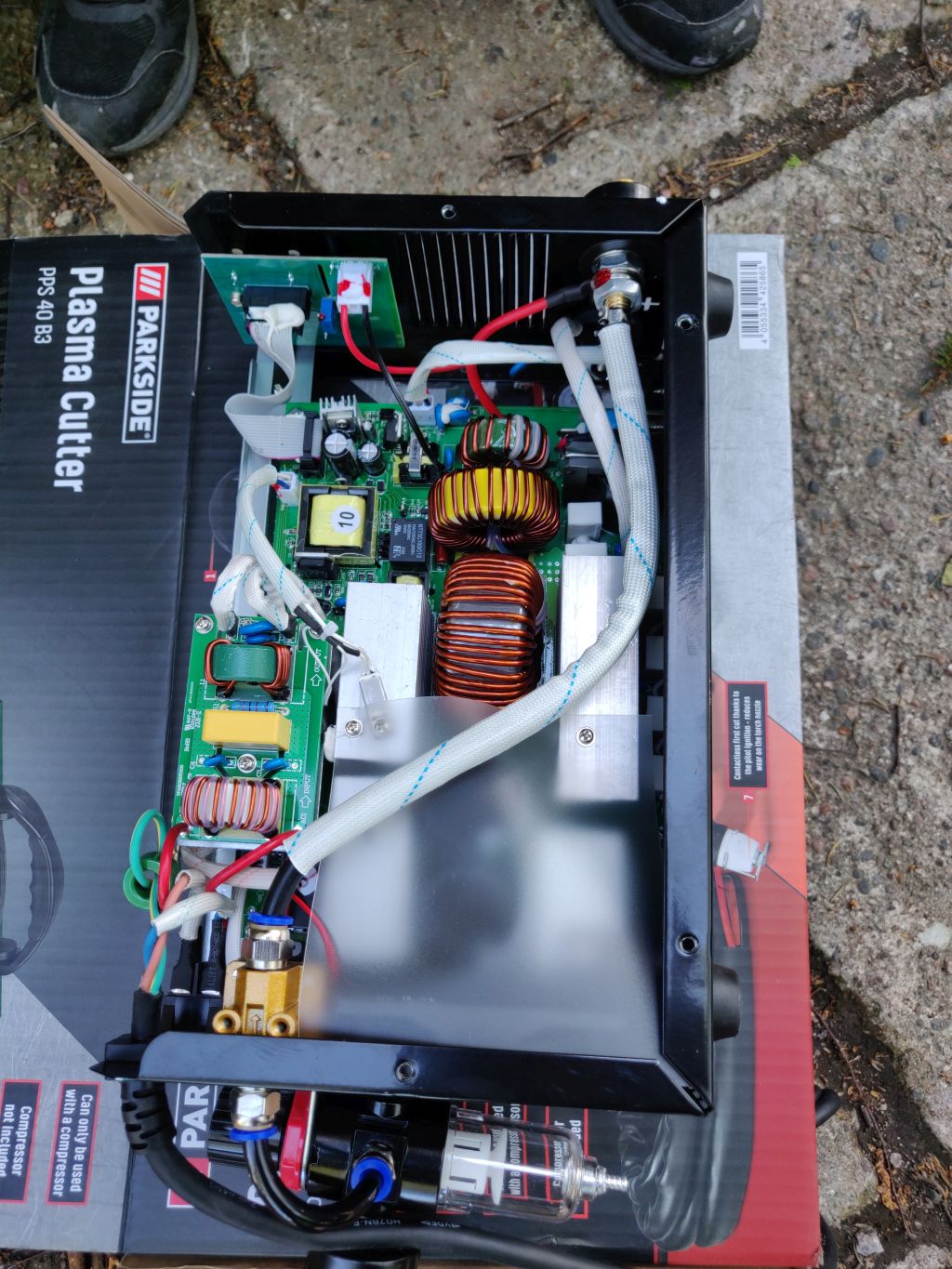 Muuntajia on pirusti. Ei tullu tarkkaan tutkittua, mutta pääpiiri näyttäisi olevan 1/2 silta. Päämuuntaja tehty isolle toroidi sydämmelle.