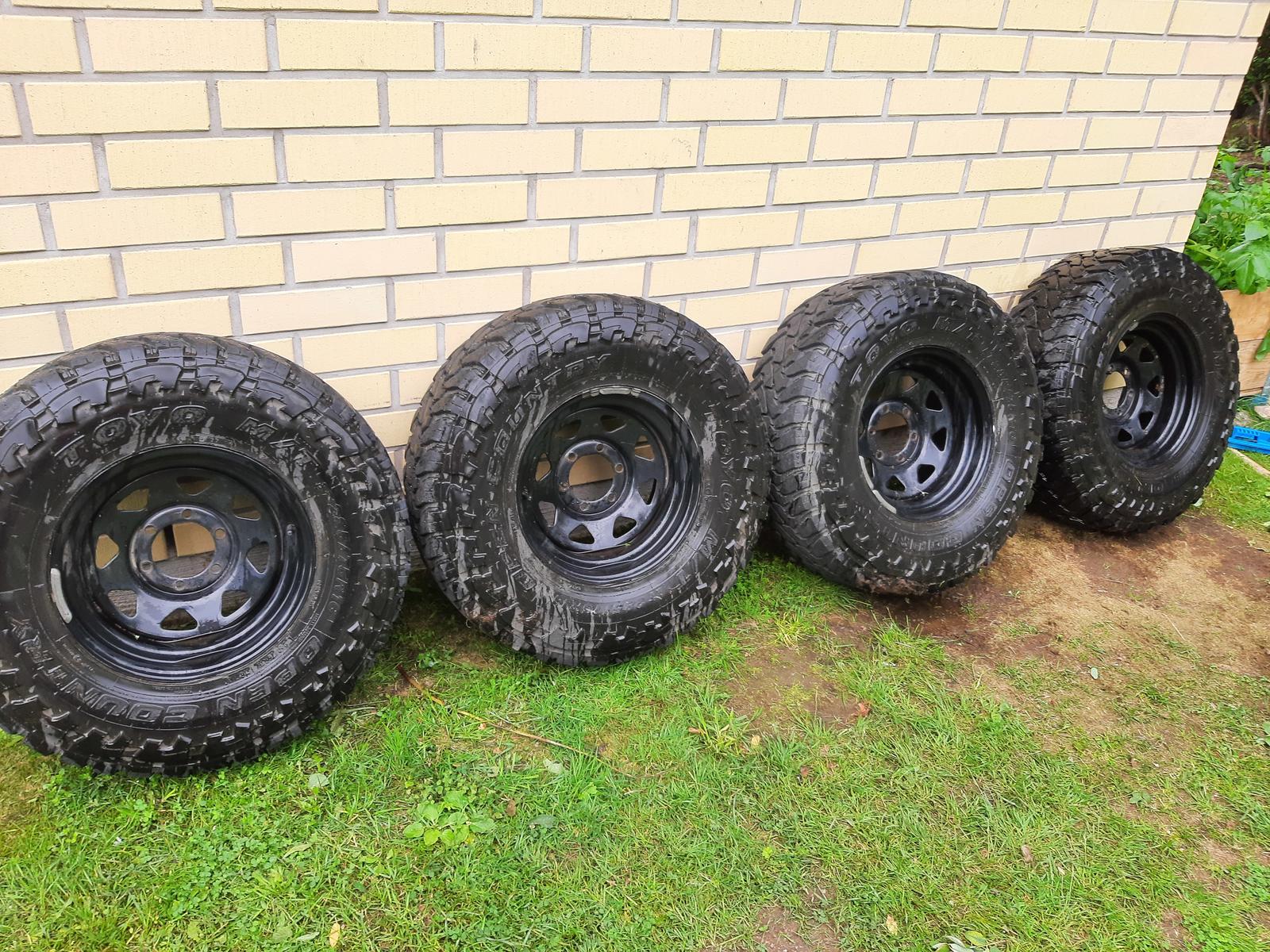 Otsikon mukainen paketti myytävänä.. Renkaat Toyo open country mt joissa keskellä pintaa 2kpl 8mm ja 2kpl 9mm.. Paistettu 27/17. Vanteet 16"×8" offset-20..