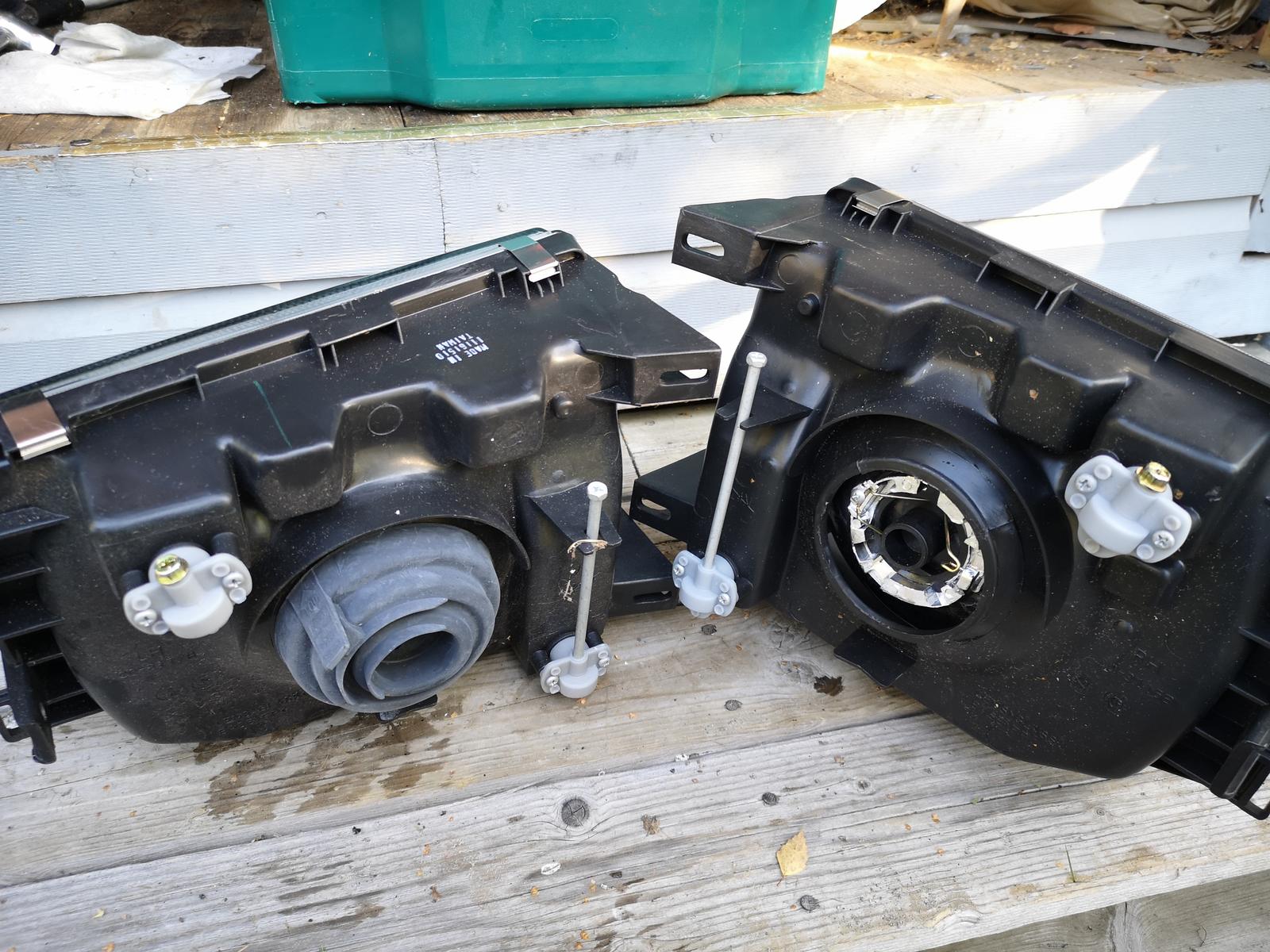 Varaston perältä löytyi tämmöset rihlatulla lasilla olevat ajovalot. Uudet valaisimet, toimii hyvin myös kunnollisilla H4-LED polttimoilla, sen verran kokeiltu. Paremmin kuin sileälasisilla umpioilla. Ei sähkösäätöä.