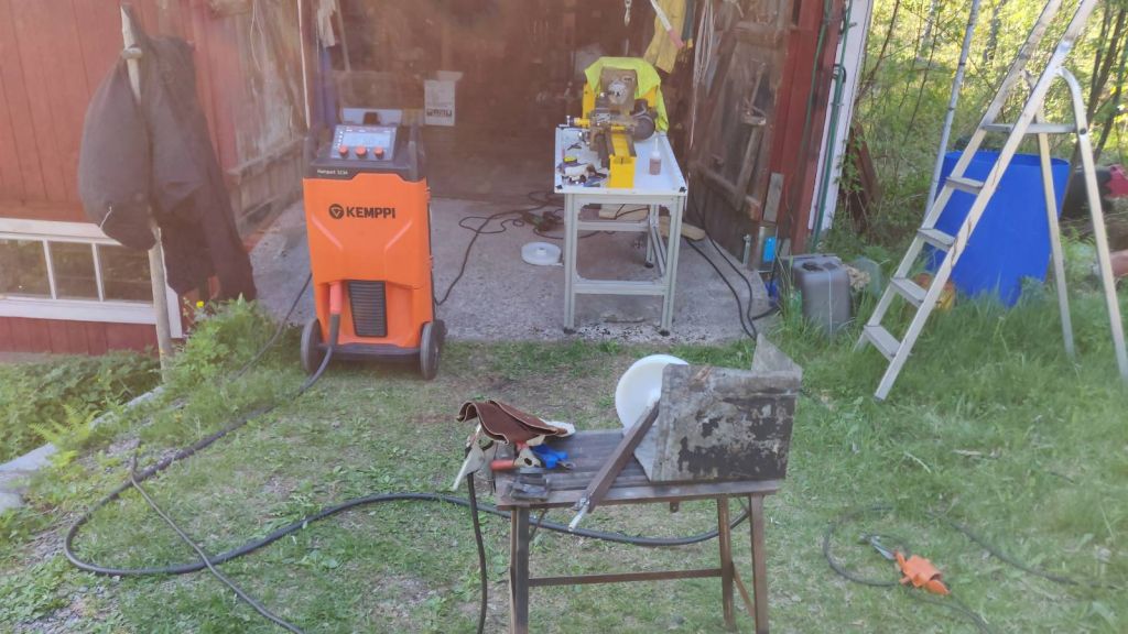 Taas opetus, että kaikki kannattaa laittaa talteen. Aikanaan on tullut jemmattua 50x50 alumiiniprofiilista tehty pukki. Aavistuksen pieni tämän sorvin alle, mutta vähän muuttelemalla profiileiden järjestysta alkoi näyttämään mahdolliselta. Hyvä raaka-aine on myös Kasteenin teräshyllyt. Jemmassa oli 100x60cm teräshyllyjä. Näistä syntyi juuri sopiva pohja ja myöjemmin vielä lastukaukalokin. Vähän kyseenalaisin konstein kone pukille ja vielä pyörät alle niin pystyy yksin liikuttelemaan. Akseli syntyi jämätavarasta ja tietysti tallessa oli tollasia isoja B-kurantteja nylon pyöriä.