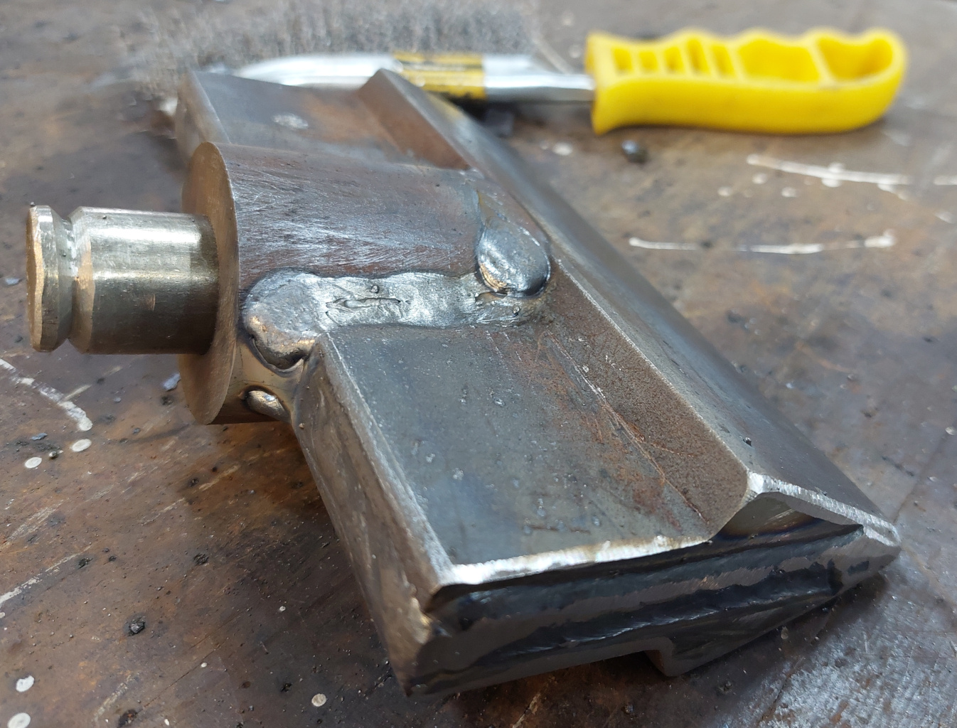 Sahasin alavasteesta pätkän ja tein prässin työkalukiinnitykseen sopivan yläterän. Yläterään löytyi materiaali pihalta, eli kauhan huulilevyn pätkä mallia "nuolen puolikas". Kaksi pätkää selät vastakkain ja hetipiti-liimalla kiinni. Prässiin kiinnitystä varten terään piti polttaa lovi, johon hitsasin tilalle ainesputken pätkän. Putken sisälle menee jämptisti 25 mm akselista tappi, jossa on lukitusura prässin työkalupitimen pidätinruuvia varten. Prässi painaa terää sen ainesputken kautta; tappi on vain terän asemointia varten.