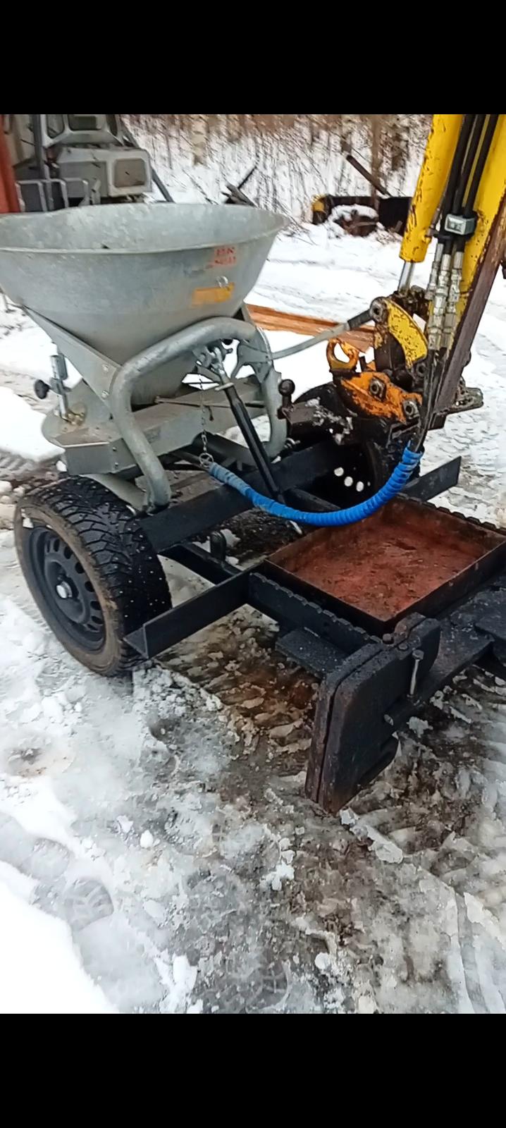 Hiekoitin on jo sovitettu perävaunuun jota voi vetää Toyotalla, kaivinkoneella ja kiinteistötraktorilla.
