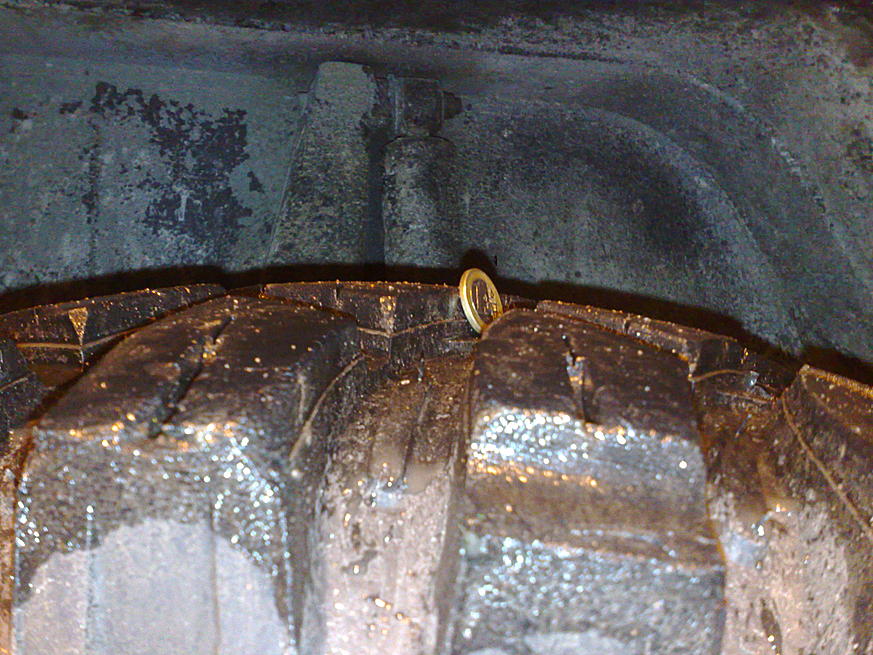 Tätä alennusta tukee muistikuvani siitä, että onhan kyseisillä renkailla ajettu yksi kokonainen kisakin ja yhteensä varmaan melkein tuhat kilometriä. Ohessa parii eilen otettua kuvaa renkaasta ja vanteesta. Kahden euron kolikkoa ei löytynyt lompakosta, niin tällä kertaa euron kolikko.
