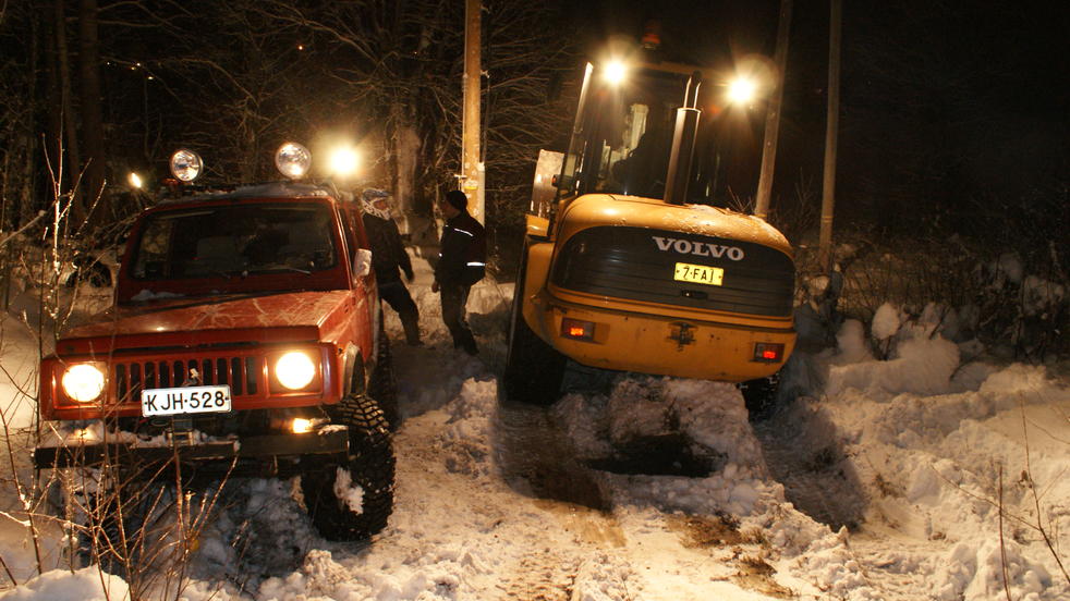 1-2 kuva oli hauskaa 3 kuva hinaus apua 4 kuva molemmat jumissa ja suitsa toimii vaan takavedolla 5 kuva lisää hinaus apua ja kotiin päästiin =)