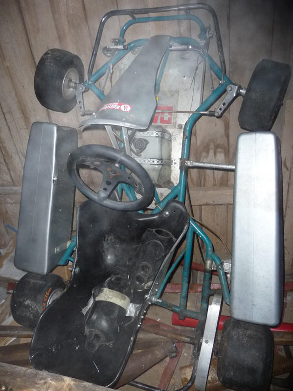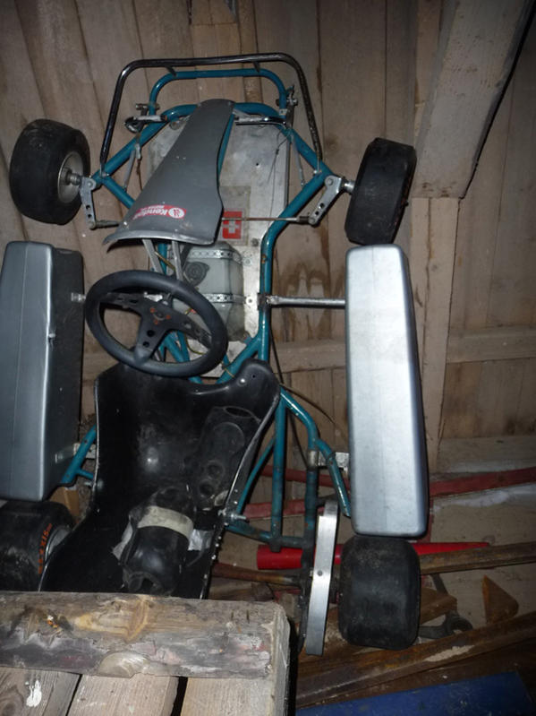 Kali-Kart rungolla oleva mikroauto ilman moottoria, ollut 85 Raket koneella. Slicksit alla, ponttoonit on, mekaaniset jarrut, penkki sopii vähän isommalle kuljettajalle. Kone paikallleen ja piikit renkaisiin ja kas siulla on oiva peli jäärata ajoihin. 260 olis hintapyyntö ja Luumäellähän tää on.