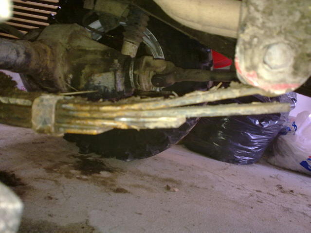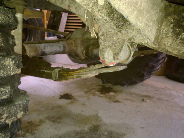 Huomasin aamusta, että suzuki (SJ410) seisoo suoralla tallin lattialla takaa katsottuna vinossa. Auton vasen puoli on noin 3 cm korkeammalla kuin oikea puoli. Auton alla tutkiskelu paljasti kuvien mukaisen vaurion vasemmassa etupakassa. Ilmeisesti eilen Kulmassa ison suo-ojan ylityksessä vasen eturengas pääsi haukkaamaan mutaan ja näemmä on saanut jousi vähän kipeätä.