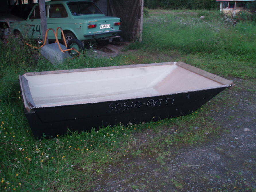 vesi pysyy joko sisällä tai ulkona. on hipasen kiikkerä-en laskis kakaroita vesille tällä, mutta tosi mieshän menee. kevyt hinata 2äijää kantaa kauas erämaalammelle ,yksinään jaksaa liikutella sorsametällä tms.. . yksinkertaista lasikuitua, vois olla viisasta laittaa vaikka vaneri pohjalle, moottoriaki koitin mutta ei helekkari,hullun hommia , no akkumoottorilla ihan jees ,mutta ei mene lähellekkään suoraan.... tee vaikka muijalle kukkalaatikko pihaan tai jos ei järkipäätä pakota niin käytä veneenä, sauvomalla menee aika hyvin kaislikossa ja matalassa