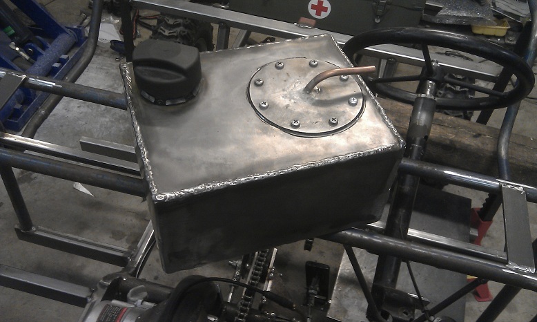 Hitsailin tankin, kun sopivaa ei oikein tuntunut löytyvän. 3mm levyä, joten painoakin tuli. Toisaalta taas ei vaadi mitään erillistä suojaa ja oli helppo hitsata. Saippuavedellä+paineilmalla testasin ja yhden vuodon löysin. Korkki on micrasta ja ei kovin retro, mutta varsinaisen korkin päällä on muovinen kuori, jonka ajattelin korvata metallisella.
