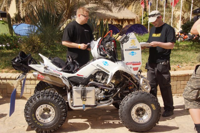 siltä osin on kaikki valmiina huomiseen starttiin. Katsastuksen jälkeen lähtivät suomalaiset ottamaan tuntumaa Saharan hiekkaan testiajon merkeissä.