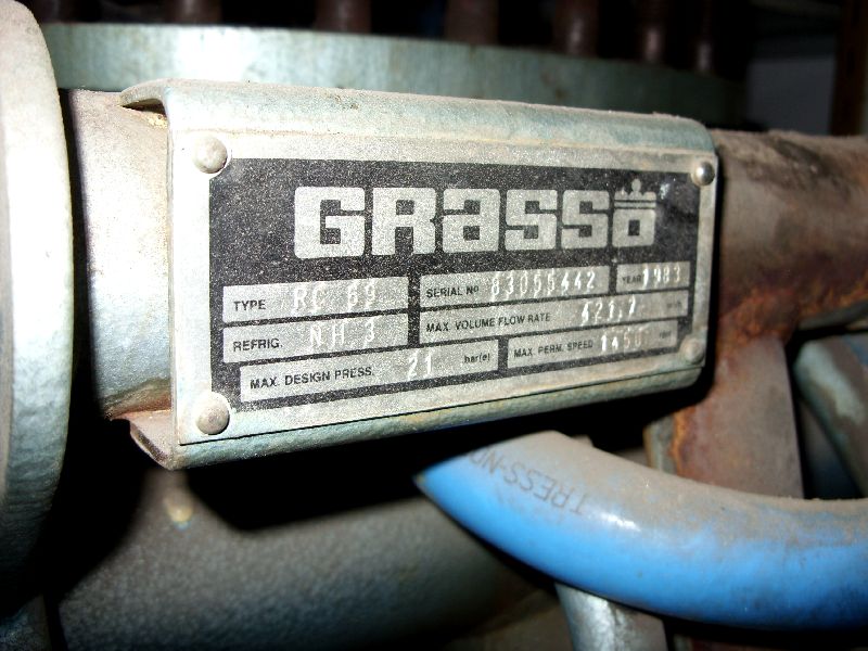 Kyseessä on siis kokkolalaisen kalanperkaamon entinen kuusipyttyinen kylmäkone merkkiä Grasso ja mallia RC 69. Järjestelmäpaine on ollut 21 bar ja jokaisen sylinterin pystyy sähköhydraulisesti kytkemään päälle tai pois. Tuoton saa muuttumaan tarpeen mukaan ja käynnistyksen aikana saa kuormaa kevennettyä merkittävästi. Pyörittämiseen sopinee joku 30-40 kW sähkömoottori tai n. 100 kW dieseli.