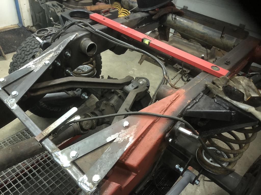 Hupsista s*na, siinähän meni about puoli vuotta hallitonta elämää. Päivän verran sai nautiskella ja hommat vähän nytkähti eteenpäin, taka-akselia mallatessahan se päivä sitten hupeni. Akseli on nyt heftissä pitkittäistukivarsien varassa. Mittailin perän ja jakiksen lähdöt samansuuntaisiksi arvioidussa ajokorkeudessa. Välikardaani oli sopivan mittainen kulmien mittailuun ja 20 astetta paukahti just rikki. Jotta selvittäis ilman tärinää ja ristikoiden päivittäistä vaihtelua ajattelin päivittää kardaaniin tuplanivelet molempiin päihin. Jos jakista siirtäis sivuun 5cm, mitä runkopalkit antaa myöten - eikä hulluttelis joustoilla, voisi vakiojortaani EHKÄ selvitä hommasta ilman jurinaa... Toisaalta kardaanin päivityksellä selviäisi ilman harmaita hiuksia ja antaisi se luvan olla rajoittamatta ulosjoustoja sen kummemmin.