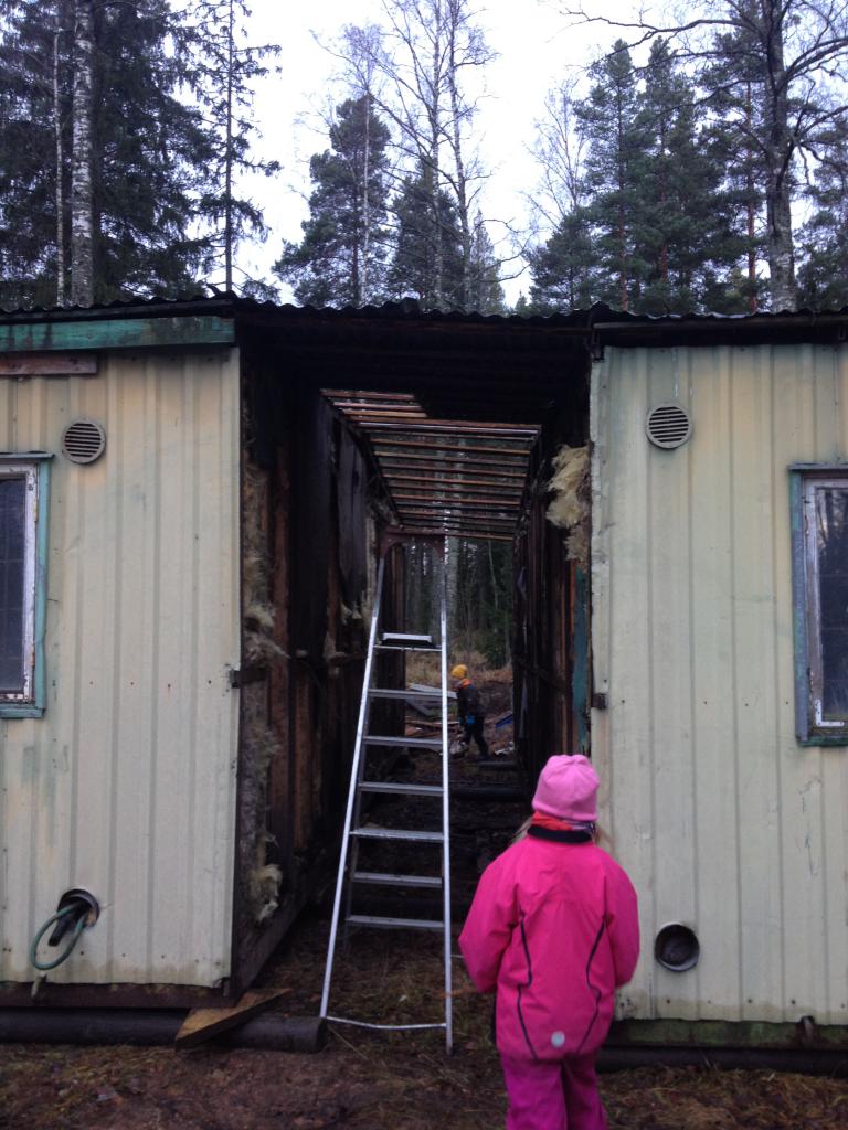 Sisätilat on melko lailla uusimista vailla, mutta runko on hyvä ja pellit ja ikkunat kunnossa. Joitain ylimääräisiä kattopellin palasia on, joten jättää parakkien väliin kulkupelin verran väliä, niin ympärillä on loisto työtilat.