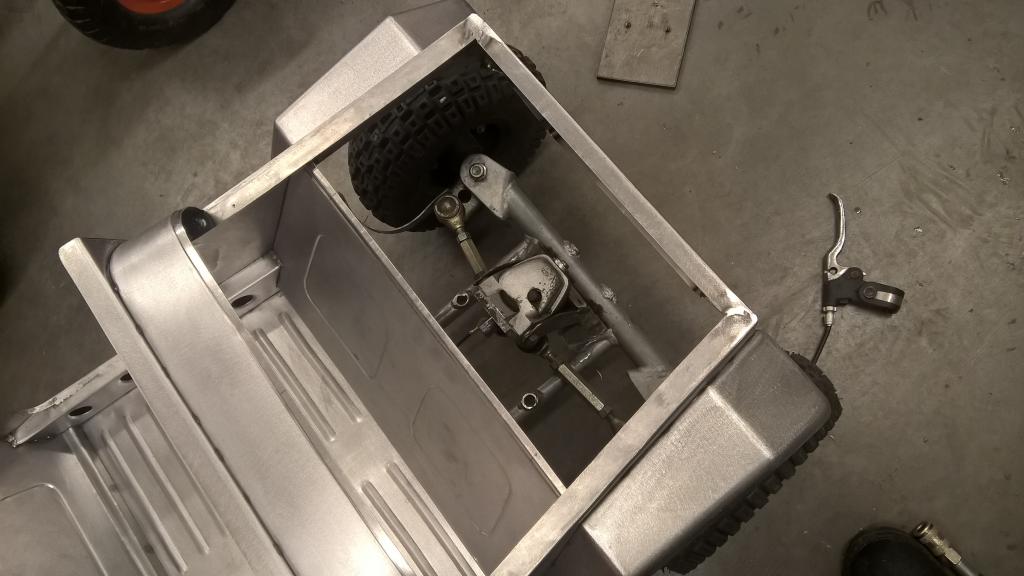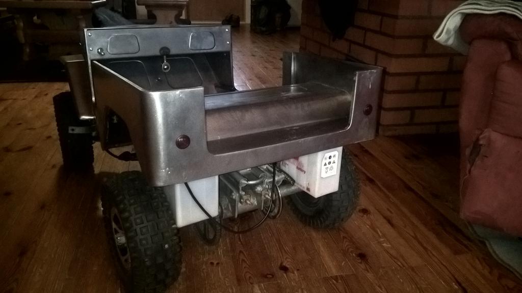 Rungon puoli alkaa hahmottua. Sähköpyörätuolin moottori haki paikkansa, joka tuli mönkijän mukana. Akkutelineelle paikka ja tilaa pitää jättää myös toiselle kun "moottorin" saa virittää tarvittaessa 24 volttiin. Oikean puoleista "poljinta" ohjataan kaukosäädöllä hajonneen sähkövinssin jäämistöllä, ettei nuori kuljettaja ole puistossa karkuteillä heti ekoilla ajokerroilla.