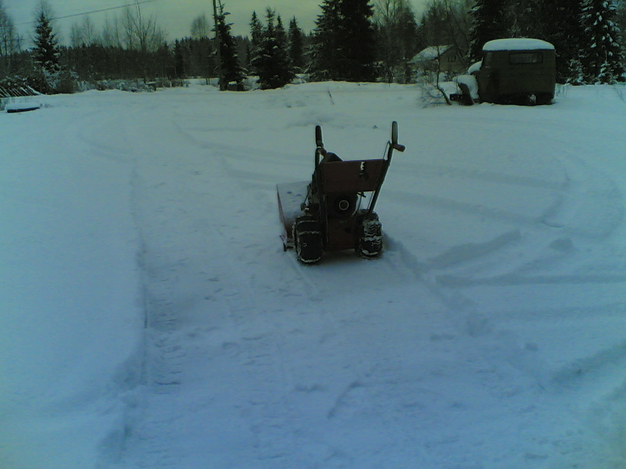 Ostin lingon 90-luvun alkupuolella vähän käytetynä veljeni appiukolla. Hänellä alkoi kerran ottamaan sydämestä, kun repi lingon käymään ja alkoi ajamaan lunta. Myi sitten lingon minulle, ilmeisesti muijansa painostuksesta, ja sopi että naapuri tekee korvausta vastaan traktorin perälevyllä lumityöt pihasta. Minä maksoin tuosta 1500 markkaa, uutena taisi olla yli kymppitonnin kone. Moottorin käyntiin repiminen ei ole ottanut minua sydämeen, mutta aivoon on. Purin narustarin pian pois, ja nykyään käynnistän sen 700 watin Bosch porakoneella. Istukkaan sopiva hylsy, taisi olla 24 mm, ja kampiakselin päästä pyörittäen käyntiin. Samalla kaasu ja ryyppy 3/4 osaa päälle, ja painallus ryyppy tutista. Porakone on parempi olla 2 vaihteella, muuten porakoneesta menee istukkapultti poikki ja/tai moottorin vauhtipyörän mutteri aukeaa. Molempia on joskus sattunut. Ohessa huono kännykkäkuva vuosien takaa. Toissapäivänä linkosin verstaan pihasta 20 cm pakkaslunta pois. Oli hyvä keli, -15, ja ei tuullut yhtään. Tuulella saa helposti lumipesun. Verstaan piha on hyvä lingottava, kun pääsee heittämään molemmin puolin. Jos tuulee pellolta, niin sitten heitetään vaan toiseen suuntaan. Lumityö ovat silloin hitaampaa ja hankalampaa, kun pitää torvea kääntää koko ajan, ja varoa ettei heitä lunta naapurin pihaan saakka. Ei siitä välttämättä ilahdu? Edellinen linkoaminen oli yhtä tuskaa. Moottori haisi rikkaalle, mutta välillä taas ampui laihuuttaan putkeen, ja meinasi sammua tämän tästä. Ja pari kertaa sammuihin, sitten vaan piti työtää koko satakiloinen roska starttimoottorin ulottuville. Nyt perjantaina otin Snow Thrower Manual-kirjan esiin, ja säädin kaasarin perus asetuksiin. Tyhjäkäynti seosruuvi oli liian kiinni, ja tehopuolen ruuvi liian auki. Säädön jälkeen toimi hyvin, ei hajua ja voimaa oli. Vähän käänsin sopparuuvia vielä aukipäin työn edetessä. Pienkone bensaa ajattelin ostaa 20 litran kannun kokeeksi, sitä myydän viereisen kaupungin asemalla letkusta. Olen katsellut ebaystä tuohon sähköstarttia. 110V malleja löytyy helpsti, 220V vähän huonommin. Muistaakseni 50-70 euroa maksaisi kuluineen. Toistaiseksi olen tyytynyt porakone starttiin. 12V startti vaatii jo enempi askartelua ollaakseen kätevä. Pyörävetoinen ketjuilla tempoilee jonkin verran. Teloilla olevaa en ole kokeillut, mutta on varmasti rauhallisempi. Olen muutaman kerran lingonnut kotitalon pihaakin, mutta vaikeata se on. Ei pääse heittämään lunta oikein mihinkää, kun on rakennuksia ja tie. Lingon vetohihna on kulutusosa. Joskus ostin, muistaakseni SGN Niemiseltä, joka oli ilmeisesti näiden maahantuoija, uuden vetohihnan. Oli pirun kallis, 250-300 markkaa, kevlar vahvistettu hi-tech remmi. Vit..., siis harmitus oli valtaisa kun kallis remmi oli suikaleina parin-kolmen vuoden jälkeen. Sen jälkeen olen käyttänyt tavallista 13 mm hihnaa, joka on kokeilemalla haettu sopivan pituiseksi. Remmi kuuluisi olla 1/2 tuumaa leveä ja terävällä profiililla. 13 mm kiljuu muutaman minuutin, sitten kuluu sopivaksi. Ja kestää jostain syyntä pidempään kuin se kevlar-hihna...!!! Pyörävedon remmin olen tainnut kerran vaihtaa, ja lingon remmin siis 4-5 kertaa. Hinhapyöriä on haljennut, peltiä kun ovat, mutta hitsaamalla saa ne kuntoon. Yhtenä talvena tein mönkijän lumilevyllä samassa pihassa lumityöt. Sillä homma kesti kaksi-kolme kertaa pidempään kuin lumilingolla. Penkat nousivat korkeaksi, lingolla sitä ongelmaa ei ole. Lingolla tekee tuon pihan noin puolessa tunnissa. Perjantaina kesti 45 min, mutta välillä kävin sisällä laittamassa puita pesään, ja ajoin muutenkin vähän tavallista laajemmalta alueelta.