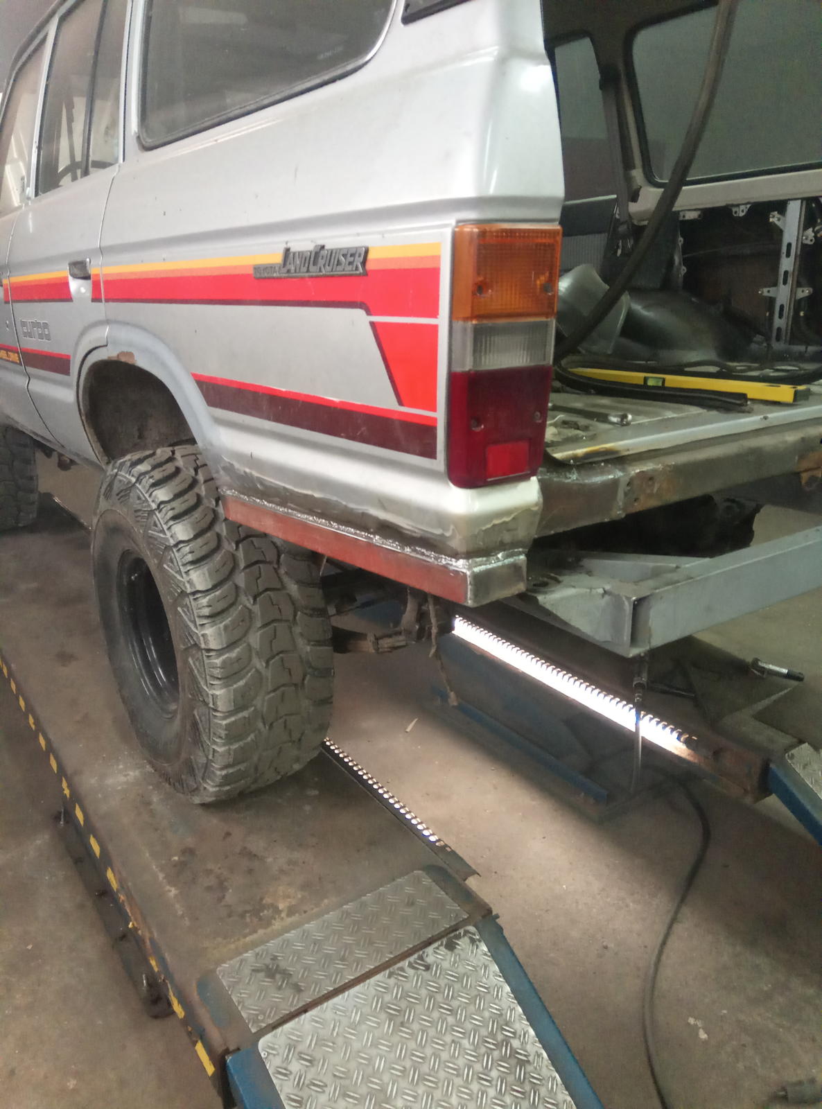 Tuon näköinen nyt. Trukkilavalla lepää mekaaninen vinssi josko sen joku laittais paikoilleen. Takapuskurin sovittelua. Painaa ihan saatanasti, 6millistä