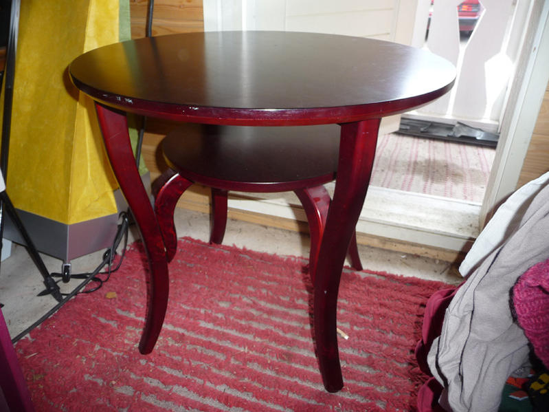 Kohtuullisen hyväkuntoinen punertavaa puuta oleva pyöreä pöytä esimerkiksi olohuoneeseen. Halkaisija 59cm ja korkeus 52cm. Maksoi joskus aikanaan omaisuuden, nyt hintapyynti 30 euroa.