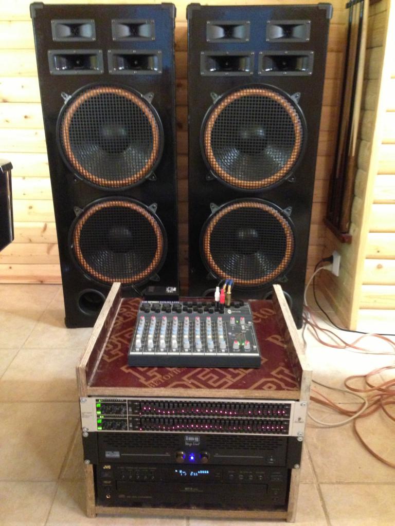 Kaupan päälle 10-metriset paksut kaiutinkaapelit, 8-metriset jatkokaapelit mikseristä EQ:lle, kasa lyhempiä piuhoja sekä cd-soitin (joko kuvan JVC karuselli tai yhden levyn Sony kaukosäädöllä). Sekä toki kuvissa näkyvä ruma "räkki".