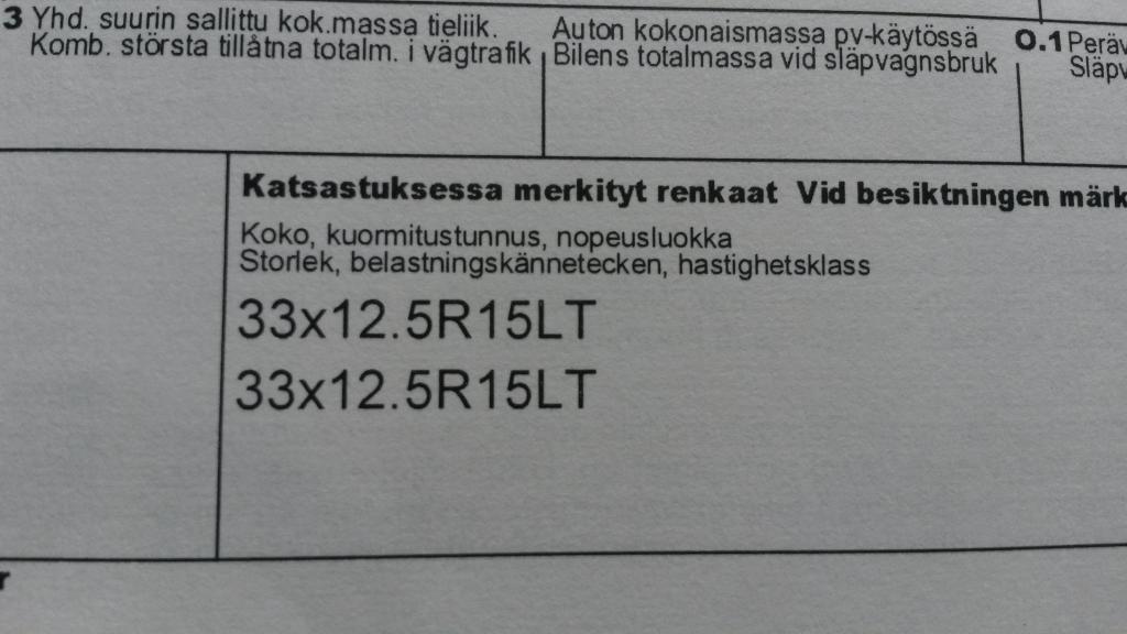 Paperit on, ei verovelkaa, otteessa mm korotus ja 33 renkaat jne.