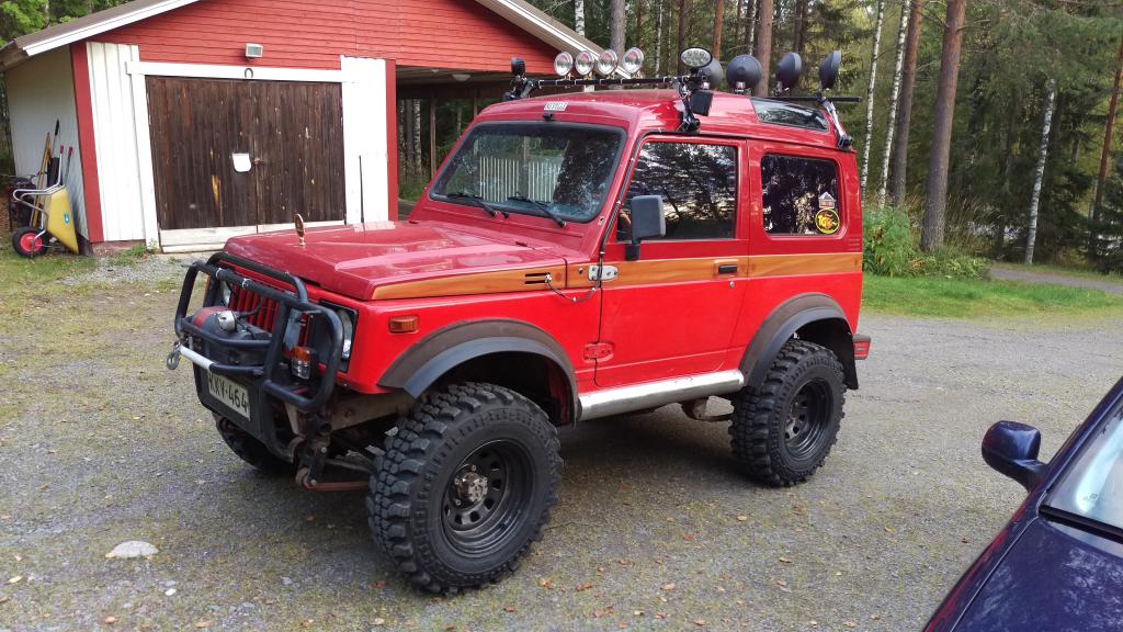 Sukisuki SamuraiNonii hetken mielijohteesta päätin ostaa tälläsen käkkyrän. Edellinen omistaja ei käsittääkseni ole autolle paljoakaan tehnyt sen siaan häntä edeltävä jonkun verran. Kysymys kuuluu onko tämä kyseinen vehje jonkun palstalaisen tekele. Kiinnostais lähinnä mitä kaikkee kyseiselle suitsalle on tehty. Tiedossa olevat virittelyt: -korin korotus (nyloni holkeilla) -pidemmät riiput -aftermarket iskarit (joissa 4wd hardware tekstit) -jotkut lehtijouset ilmeisesti korkeammat ja löysemmät ( vain kahdella lehdellä ja kanssa löytyy nuo 4wd hardware leimat) -uretaanipuslat (kai) -persiissä lock right lukko -isompi laturi ja hirveet valoviritykset -isompi syyläri - isommat renkaat (kaimaan 235/75/16) Seuraava huolenaiheeni ovatkin varaosat. Auton mukana tuli neljä laatikollista osia sisältäen mm. toisen moottorin osina, pari kaasaria, orkkis alustan osia yms. Edellinen omistaja ei osistakaan tiennyt sen enempää ku että niitä on. Nii jos tämä on jonkun palstalaisen paketti nii mikä on sen toisen motin tarina, onko se moottori ehjä vai mitenkä? Päällepäin kaikki näyttää iha ehyeltä, mutta epäilyttää ku imusarjasta päätellen sitä on yritetty ahtaa ![]() Sitten tullaan tähän hauskimpaan osioon ns. jatkojalostukseen. Kävin suitsalla kömpimässä kelkkareitillä ja totesin että jakolaatikko pitää saaha hitaammaks. Ensimmäisenä netistä hyökkäsi tuo trail-gear 6.5:1 välytyssarja. Tekeekö kyseilessä paketilla mitään ja mitä tuo pitkan puolen 20% lyhennys käytännössä tarkoittaa tekeekö se maantieajosta tuskallista vai menettelevää? Toinen huomaamaani seikka oli moottorin vääntö/teho jota ei oikeastaan ollut. Onko järkeä modailla tuosta toisesta motista vähän pirteämpi mylly vai onko idea jo kuollut syntyessään. Tiedän että porukka mättää näihin niitä 1,6 sukisukin koneita ja jopa jtn volkkarin kiisseleita. 1.6 moottorit oli minun googletuksen taidoilla aika lailla kiven alla tai sitten poskettoman kalliita, volkkarin koneen sovittaminen sitten taas tuntuu liian hankalaalta. Jos päädyn tohon 1.3 piiskan näpertelyyn niin näin aluks meinasin kannen heittää kansispesialistille ja sen kylykeen ettiä toimiva ruisku. Onko idea ihan tuhoon tuomittu ja mitä ruiskuja on ihmiset mättäneen näihin vehkeisiin. Toimiiko esim 90-luvun alun corollan ruisku tohon mitenkään.....?Mekaaninen ja sähköinen sovitus ei ole ongelma. Siinäpä se pahoittelen kirjoitusvirheitä joita tod.näk. on.