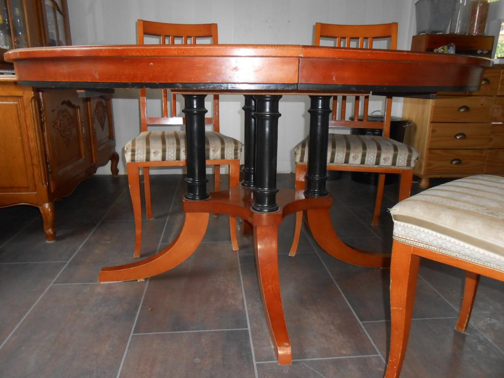 massiivinen ruokailuryhmäMyydään Myydään jatkettava pöytä ja neljä tuolia. Tuolien istuin kankaat vaihdettavavissa ja kaipaakin vaihtoa.Kyseistä pöytää on aikoinaan huonekaluliike Arvo Virtanen myynyt, mistä tämäkin on. 200€ yv tai viestiä 045 125 7575 Sami Myydään