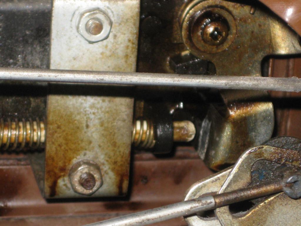 Tuossa on kuva lukkomekanismista sisäpuolelta. Ongelma on että tuo valkea muovitappi ei työnnä riittävästi tuota viistoa metalliliparetta ja oven lukko ei aukea. Tappi on joko kulunut liian lyhyeksi tai taipuu vanhuuttaan.