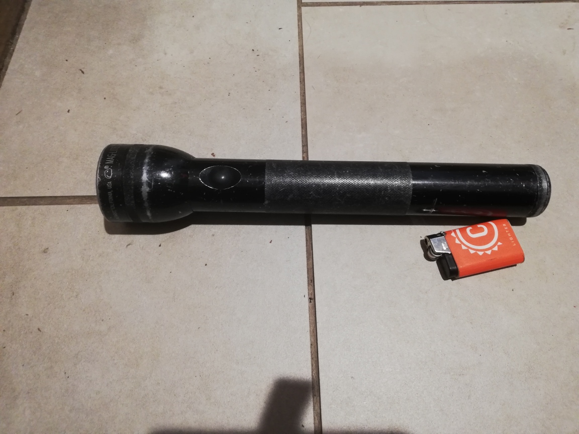 -Maglite 30cm pitkä. Tämä legendaarinen nuija on vielä perinteisellä polttimolla varustettu mutta näihin saa ostettua led-polttimon tilalle. Linssissä muutama kipinän jälki. H:30€